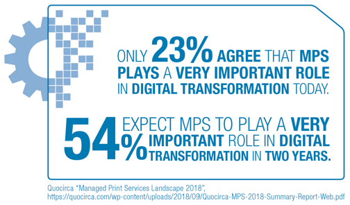 Every company is different and the extent of digitalisation can vary enormously from company to company. However, across the board, the challenge of legacy print services is well known: businesses struggle with the cost, inefficiency and administrative overhead of maintaining solutions from multiple vendors while at the same time seeking to reduce waste and tighten security. Hence, companies are placing an increasing emphasis on optimising printing services. Today, just under a quarter (23%) agree that MPS play a very important role in digital transformation, but 54% expect it to do so in two years’ time. [2]